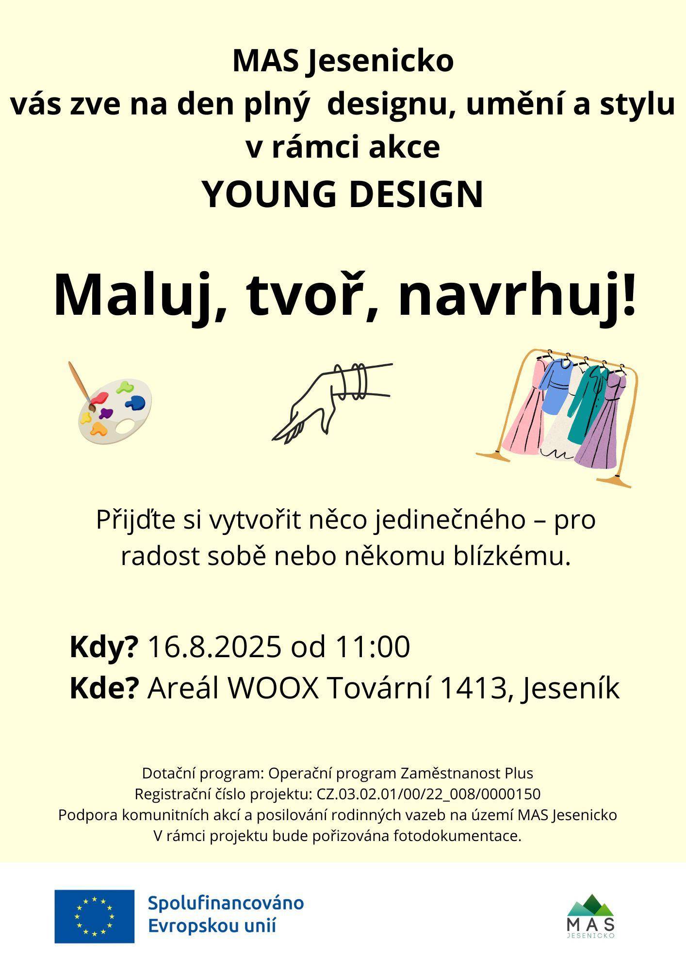 MALUJ, TVOŘ, NAVRHUJ V RÁMCI YOUNG DESIGN12.08.2025 Kdy? 16.8.2025 od 11:00 hodKde? Areál WOOX, Tovární 1413, Jeseník 790 01